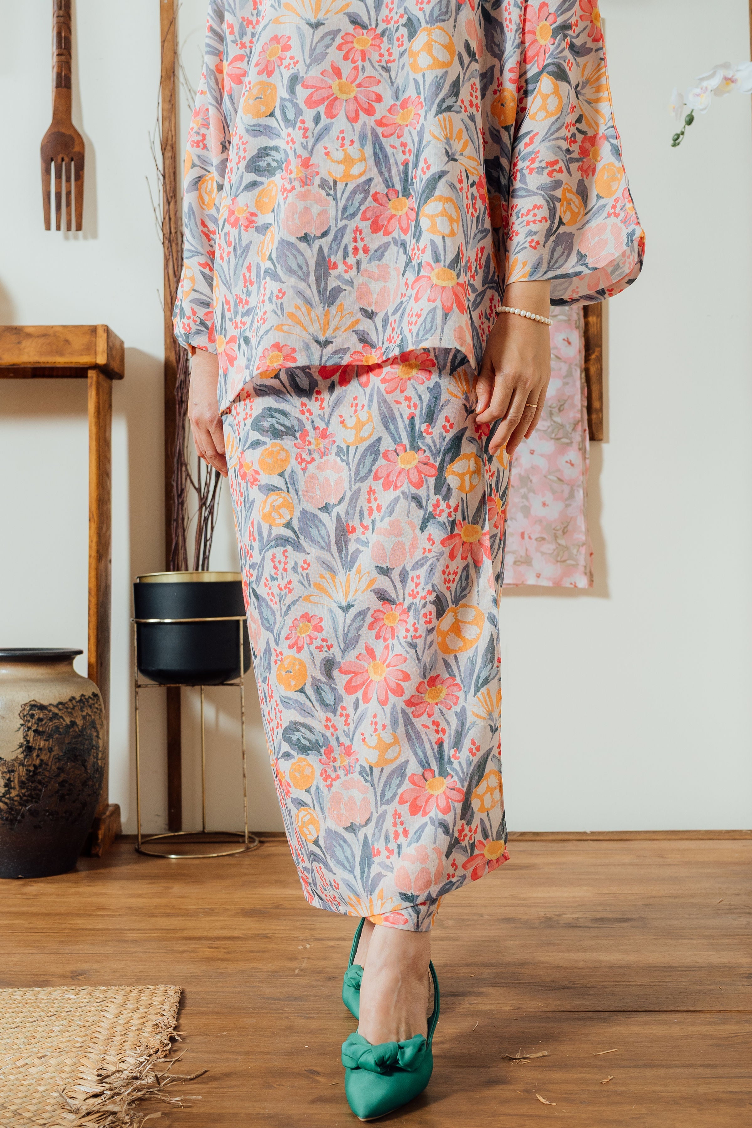The modern Kurung Kedah silhouette draws inspiration from traditional daily wear, reimagined for comfort and ease, paired with a flattering kain ikat-style skirt that adapts beautifully to different body shapes.